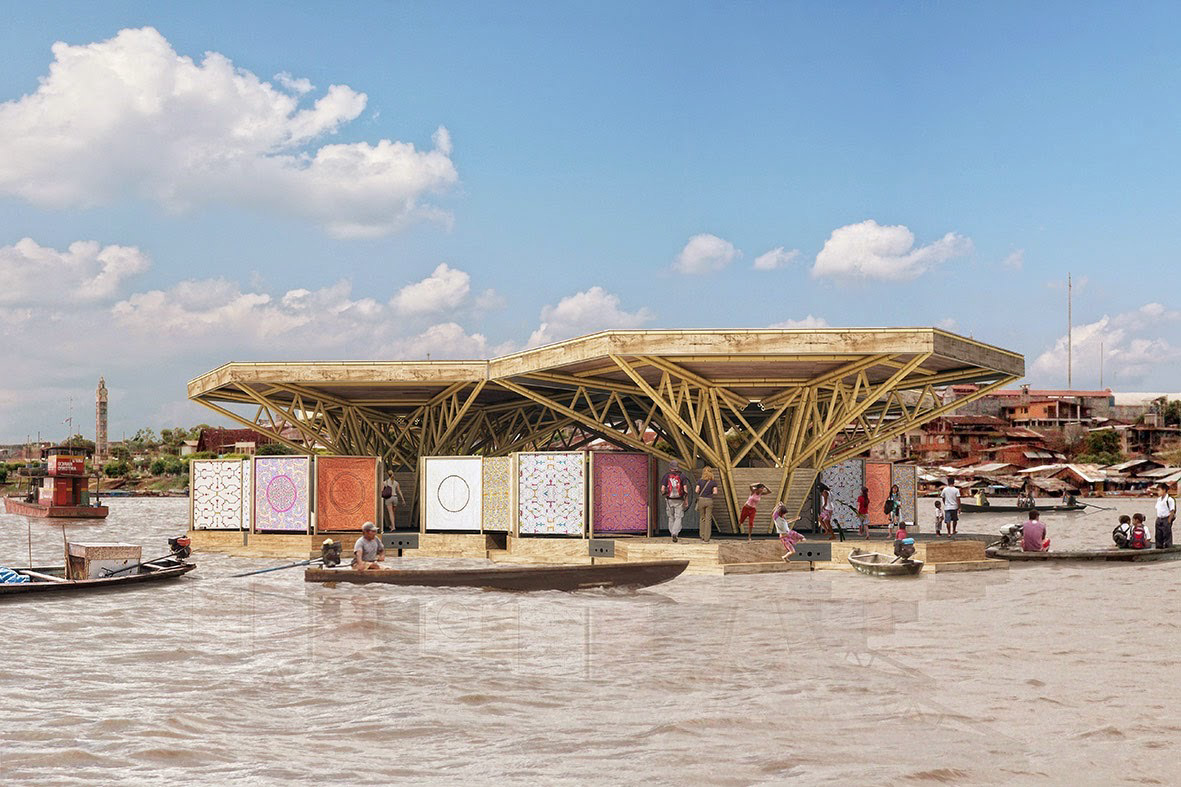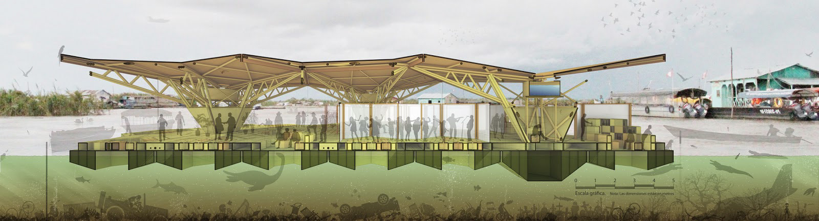 El diseño se basa en un sistema modular de plataformas flotantes que permite flexibilidad, crecimiento progresivo y adaptación a las condiciones cambiantes del entorno. A través de una geometría hexagonal, los módulos se agrupan para conformar distintos espacios destinados a actividades educativas, comerciales y recreativas. El centro incluye una guardería, áreas de reunión y un mercado comunitario, consolidándose como un núcleo activo dentro de la comunidad. Asimismo, se incorporan estrategias sostenibles como la recolección de agua de lluvia y el uso de materiales locales, respondiendo a la escasez de recursos y al contexto amazónico.